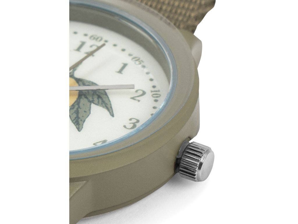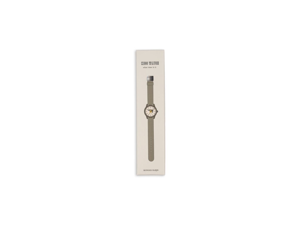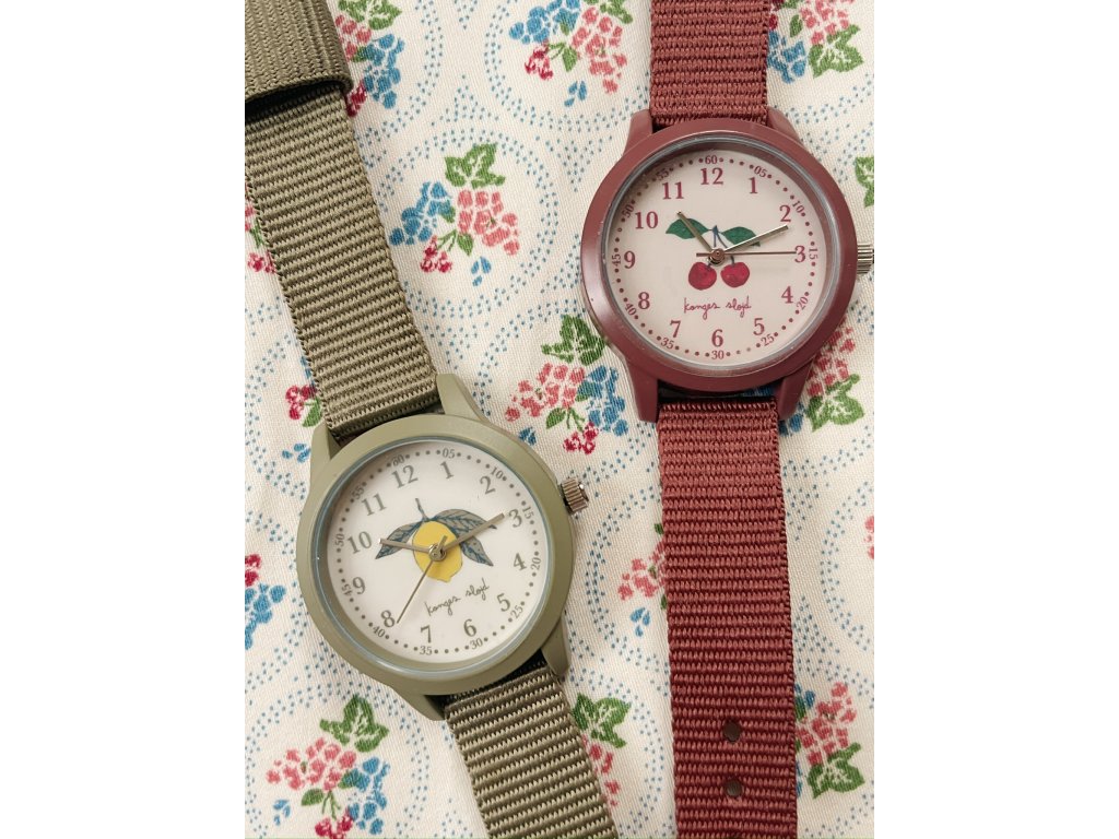 Dětské náramkové hodinky s třešinkou. Hodinky a 5minutové kroky jsou označeny a zbytek je ohraničen tečkami. Navrženy s tříručkovým strojkem, měkkým látkovým řemínkem a nastavitelnou ocelovou přezkou. Vhodné od 3 let. Označení CE.