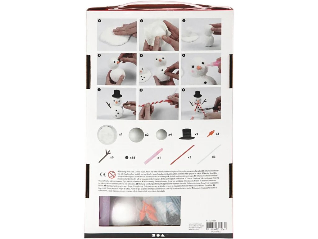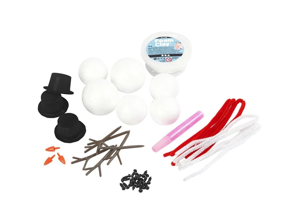 Obsah: Pěnová hlína se třpytkami na pokrytí kuliček. Dále 6 ks kuliček z polystyrenu, chlupaté drátky, třpytivé lepidlo, oči, nosy, čepice a ruce.