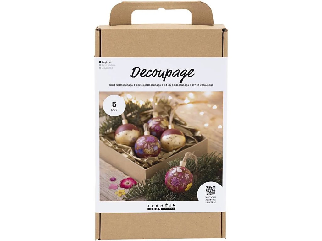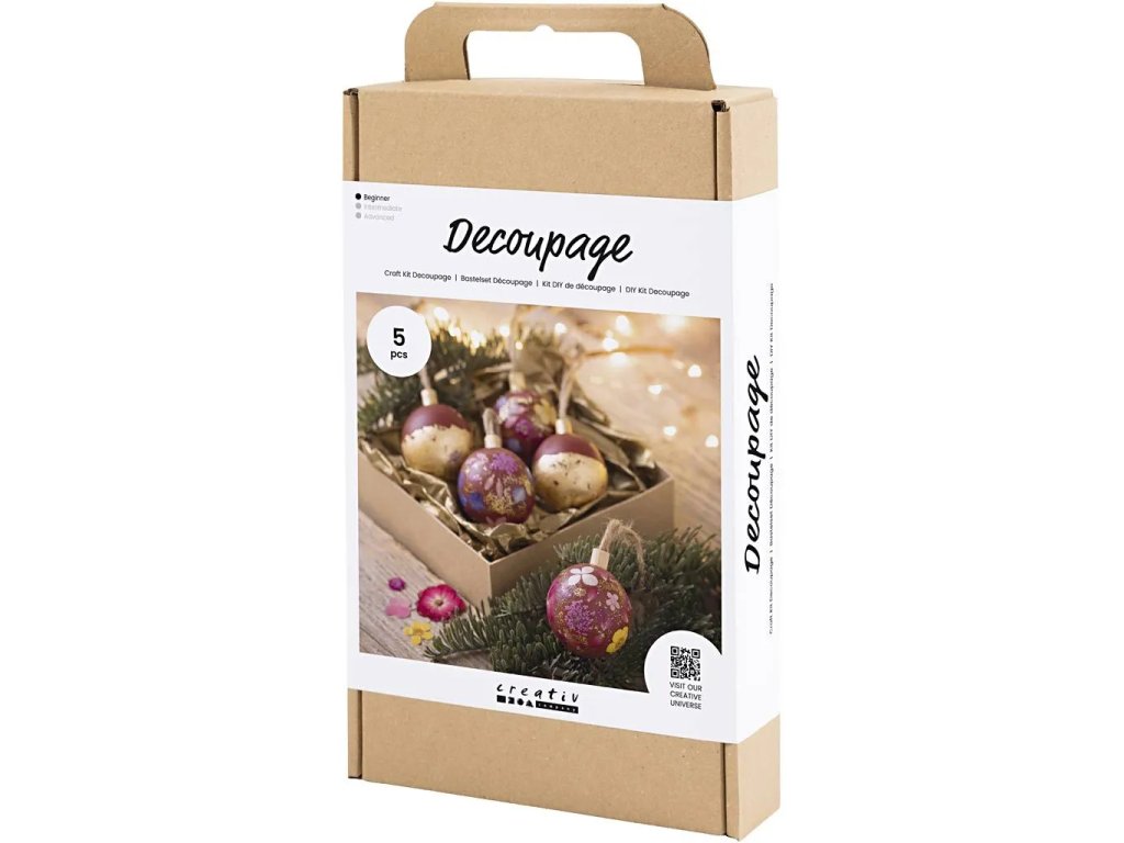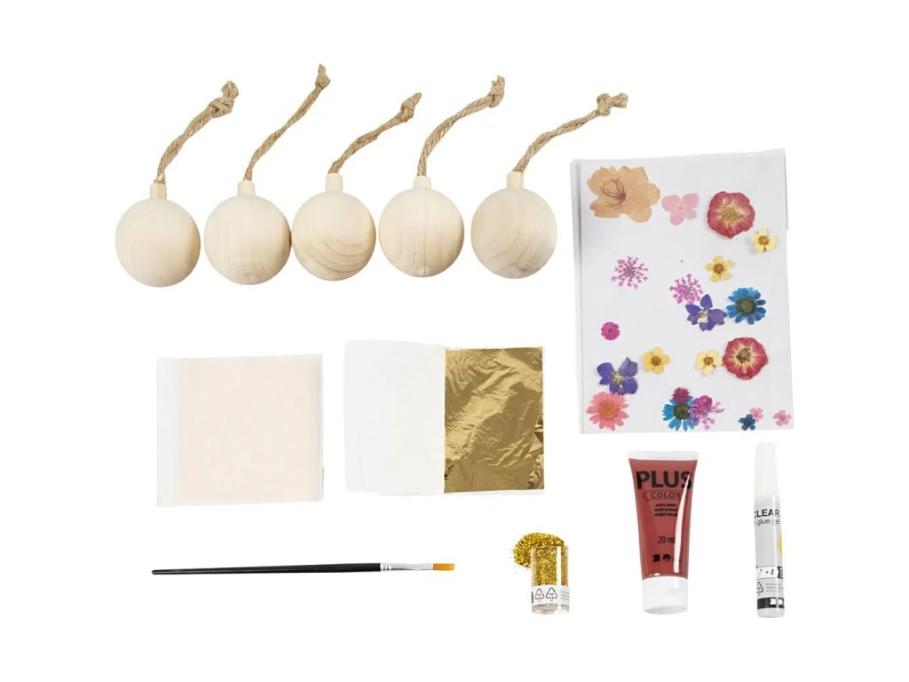 Pokud chcete, aby letošní vánoční dekorace byla dobrodružná, tato sada je pro vás ta pravá. Sada vám umožní vyrobit pět krásných vánočních kousků buď s plátkovým zlatem nebo sušenými květinami. Dřevěné koule nejprve natřete hobby barvou – poté slepte a ozdobte. Pokud chcete, můžete přidat i posyp zlatými třpytkami pro extra kouzelný vzhled.