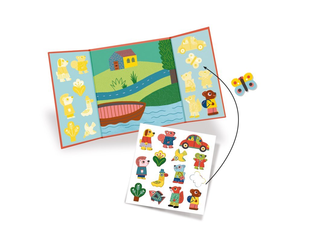 Které zvířátko popluje na lodi a které půjde na procházku? Ryba patří do vody a motýlek nejraději létá na louce. Krásná samolepková hra je vhodná pro děti od 18 měsíců. Balení obsahuje podkladový obrázek a samolepky zvířátek, které je potřeba rozmístit podle nálady.
